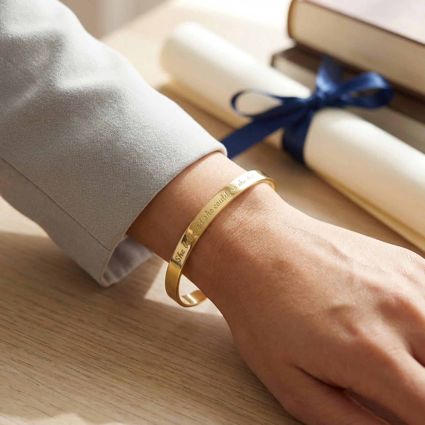 Mark the moment with a bracelet that tells the story: graduation year, name and a short message of encouragement, all on one timeless piece.