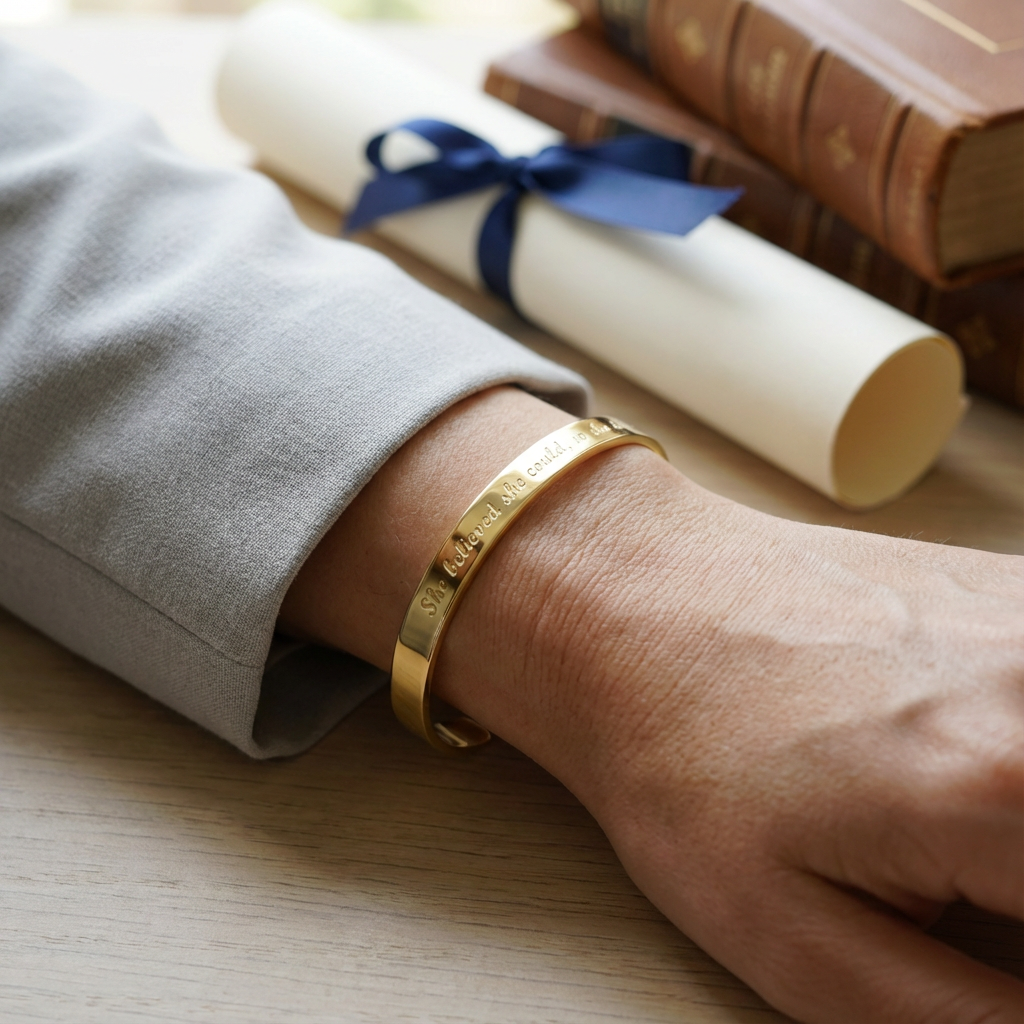 Our gold-plated bracelet is fully customizable. You can have the year of graduating commemorated in Roman numerals for a special yet subtle way to remember. You can also have some quote, University Logo or Graduate's Name.