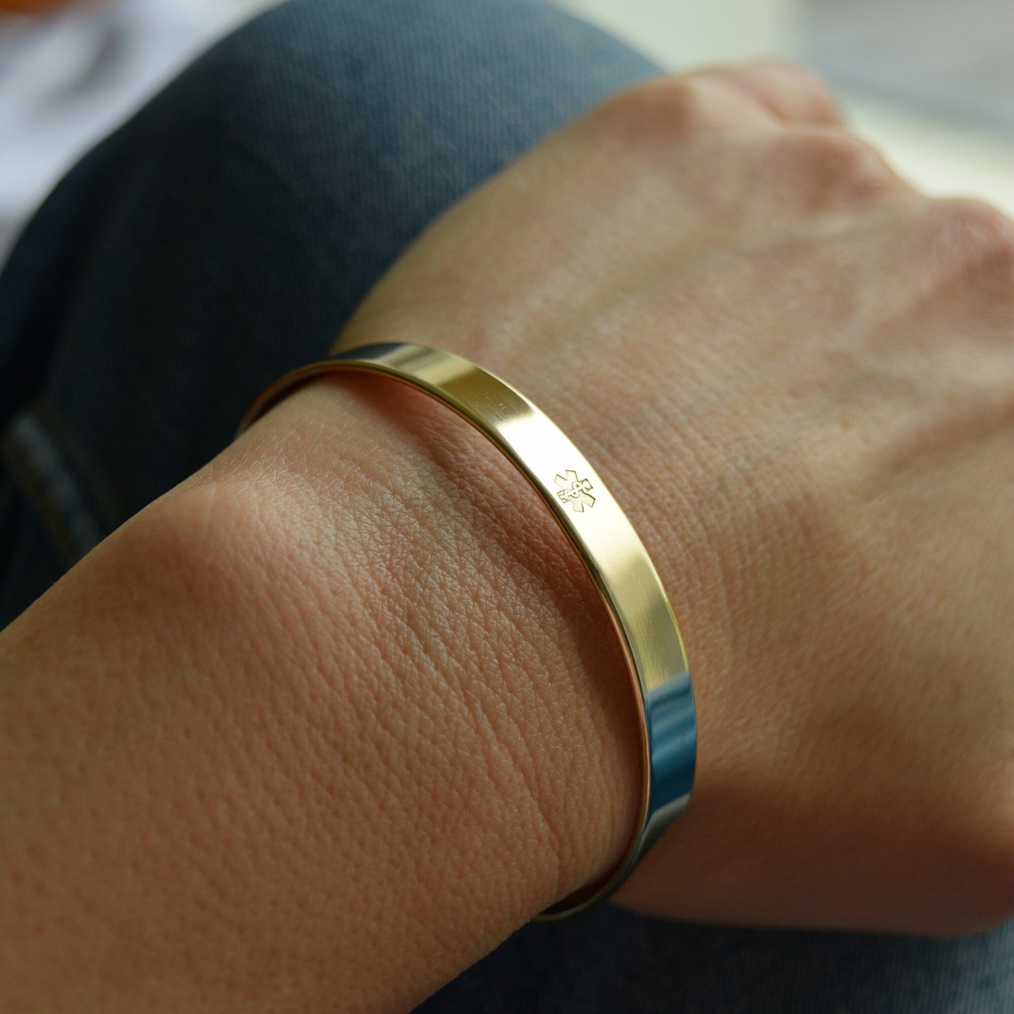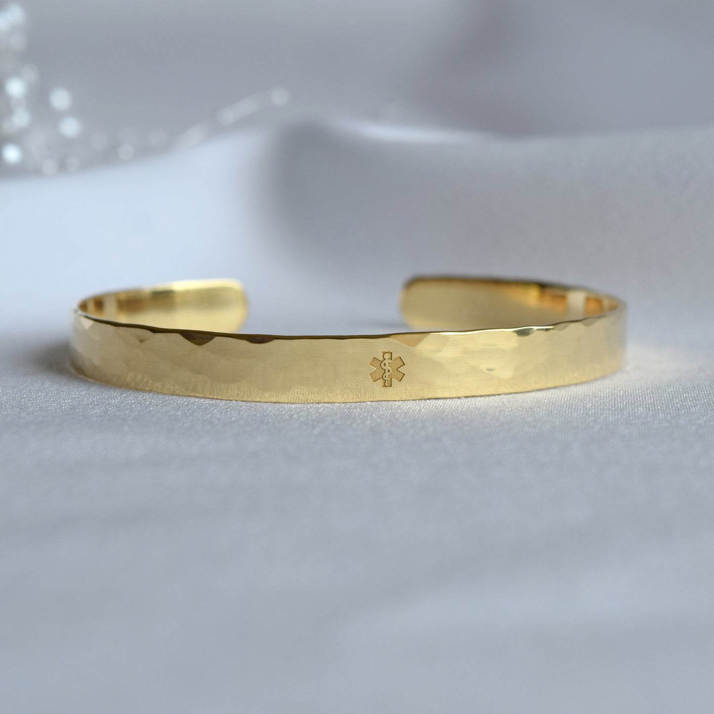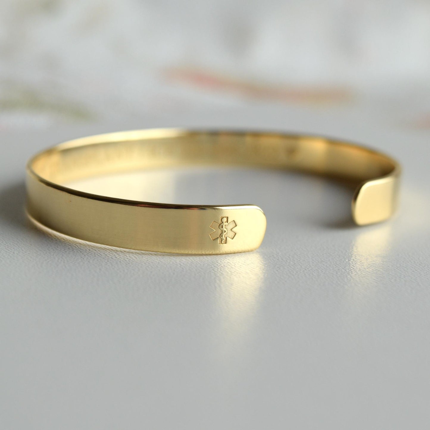 - The medical alert symbol (star of life) can be engraved in the middle of the bracelet or at the end, as shown on the photos