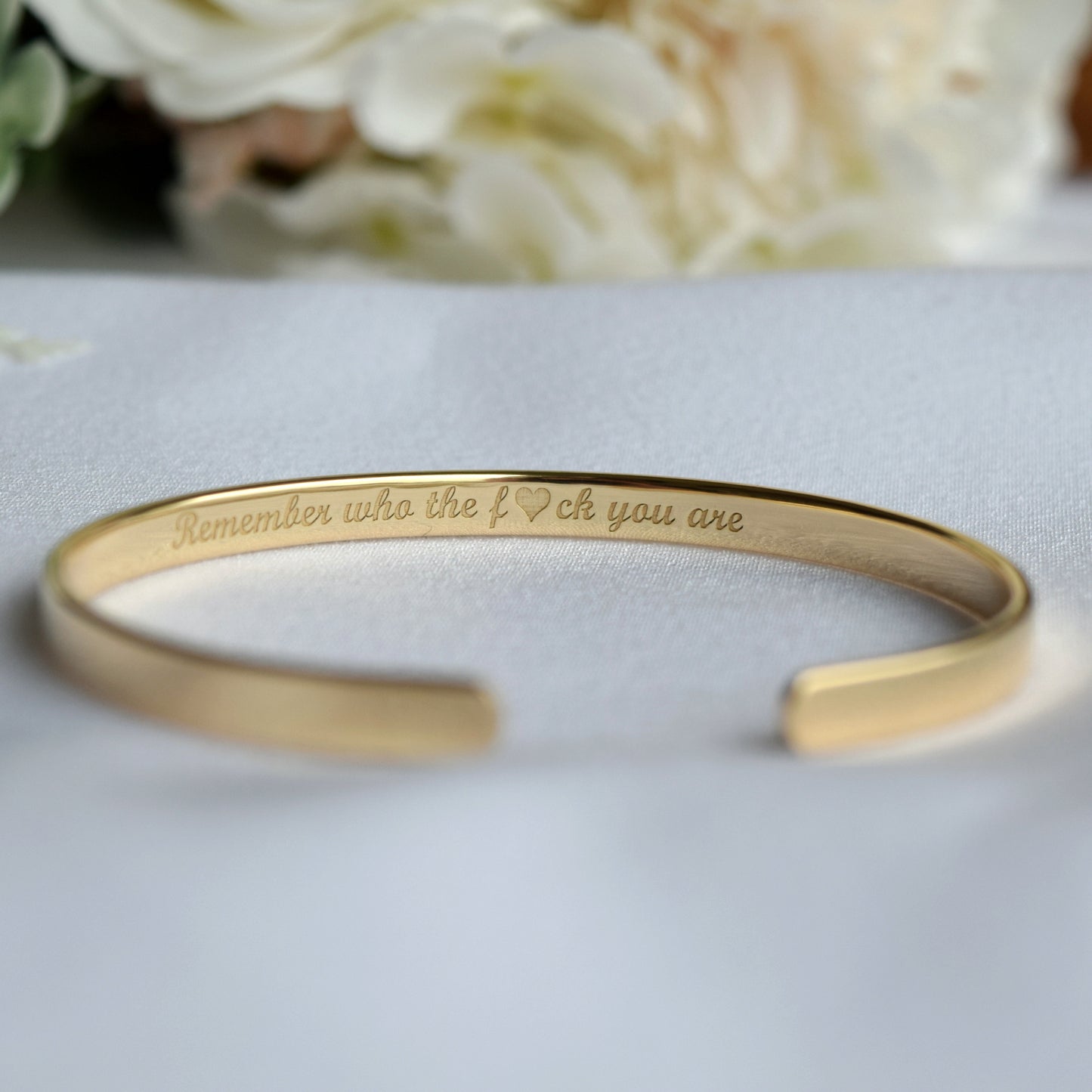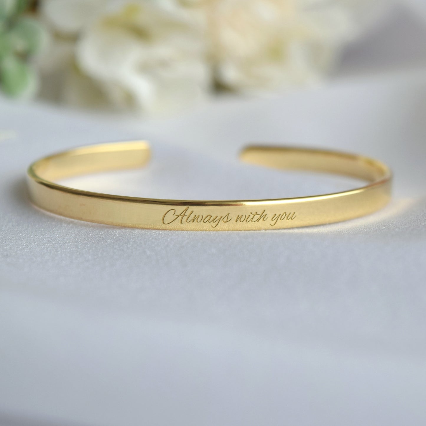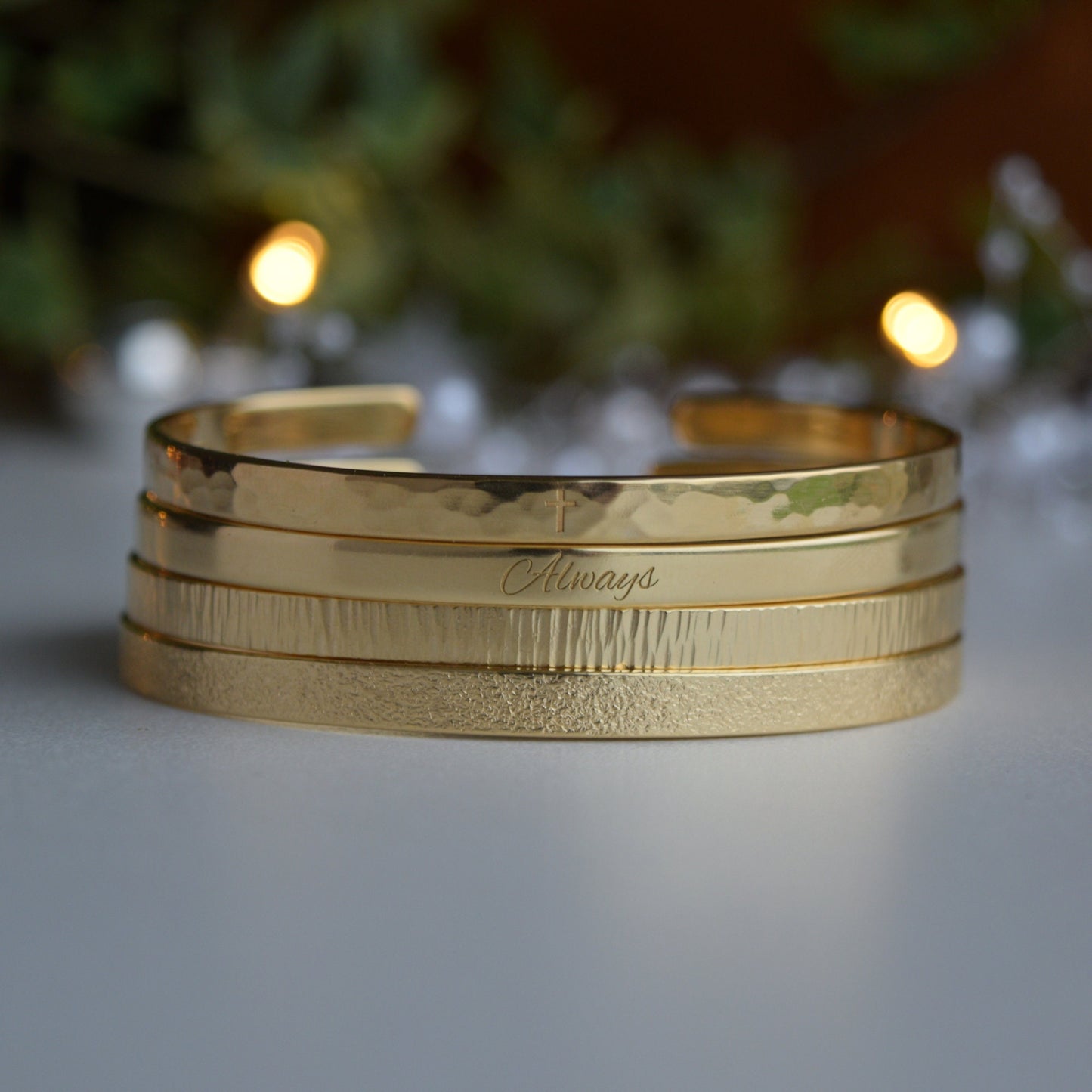 Treat someone special (or yourself) to a meaningful gold cuff bracelet engraved with your own words. This minimalist 22K gold plated cuff is made to order and personalized with your message, coordinates, numbers or handwriting on the outside, inside, or both sides of the bracelet.