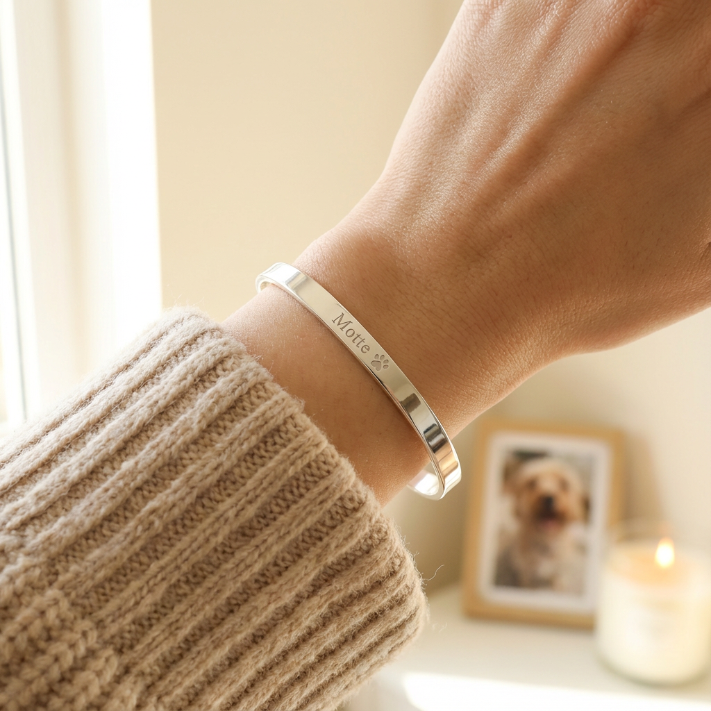Personalized Pet Memorial Bracelet: Sterling Silver Paw Print Cuff