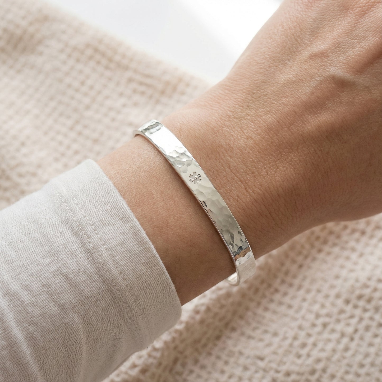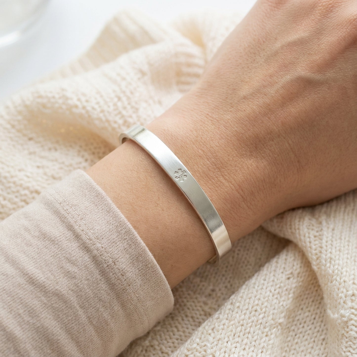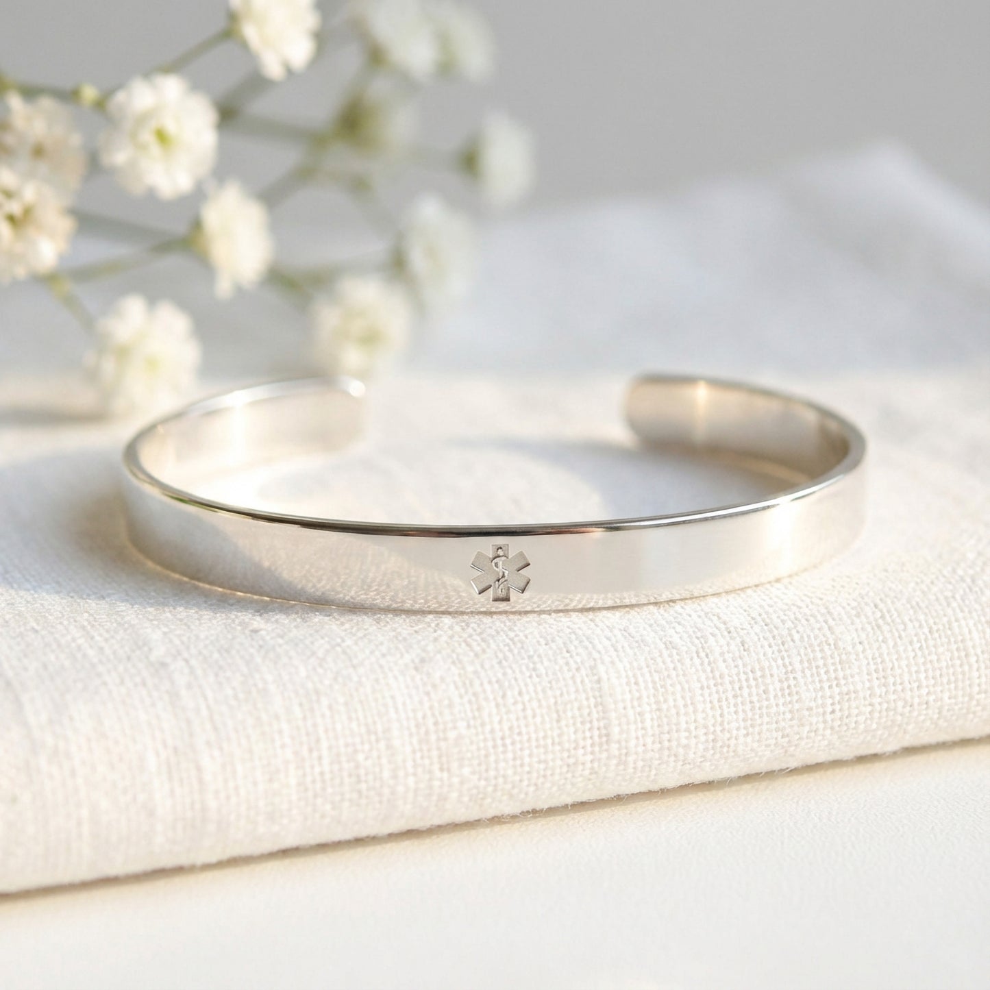 Sterling Silver Medical Alert Bracelet: ID Cuff with Engraved Diseases, Medicines, 1/4 ich Wide